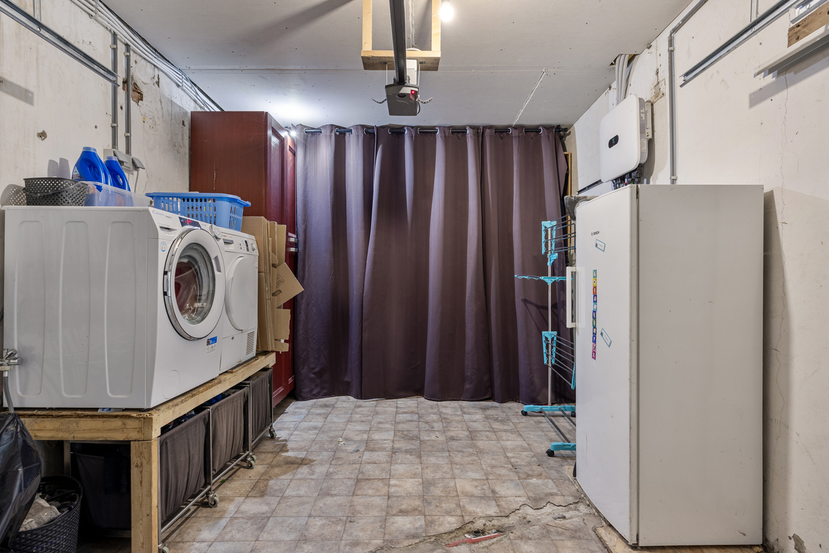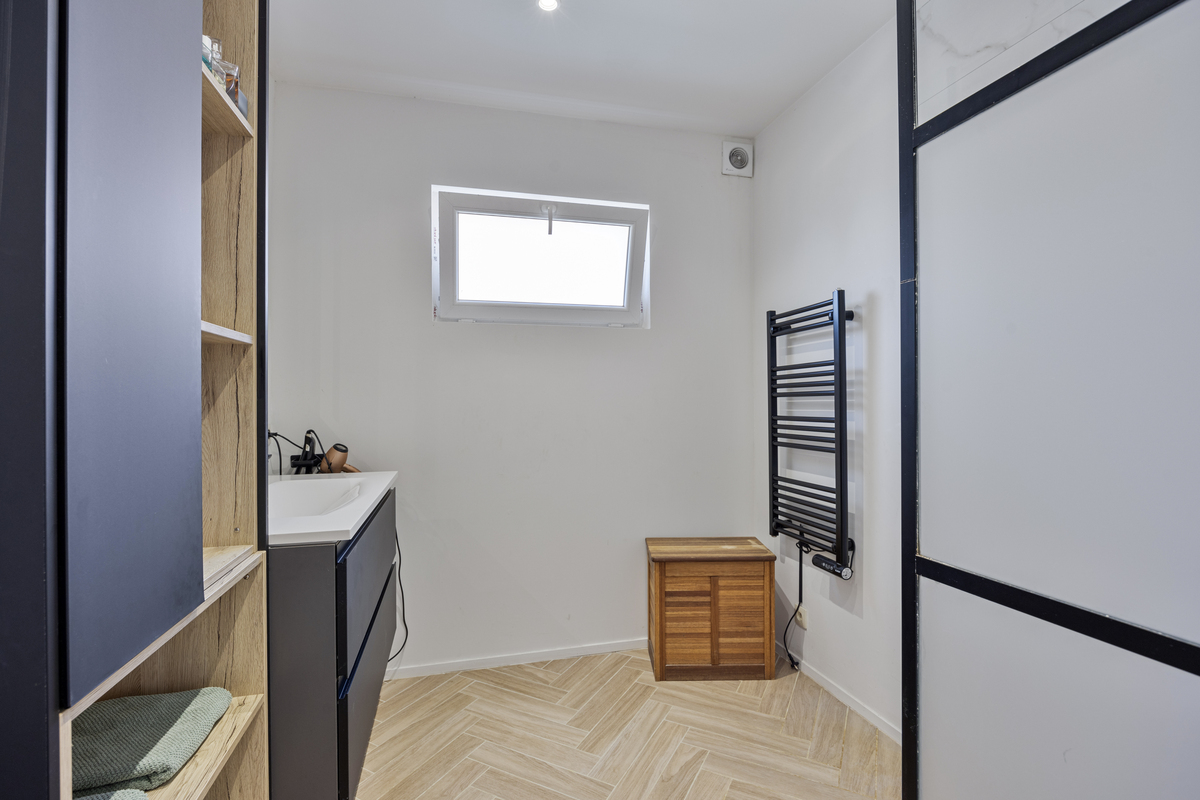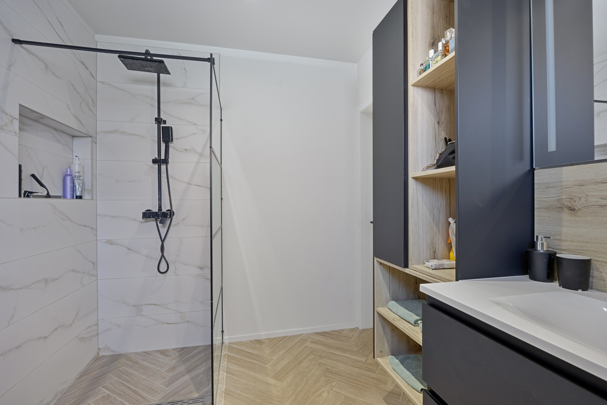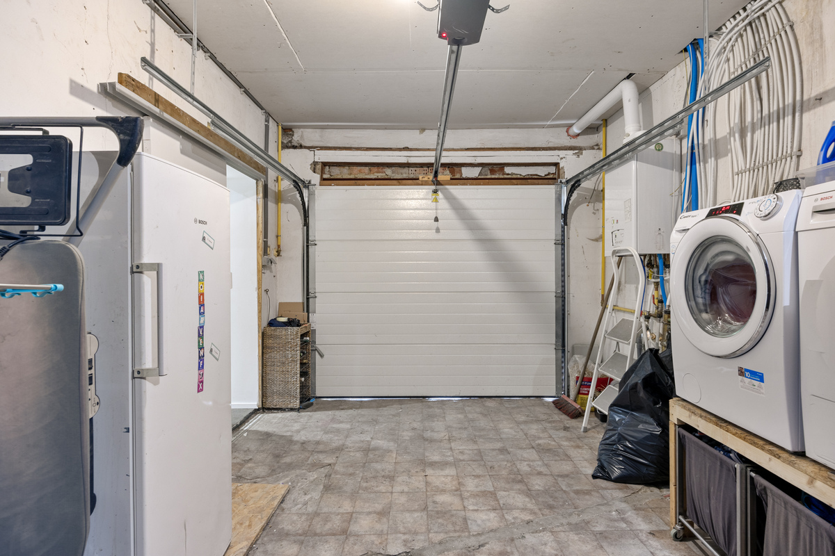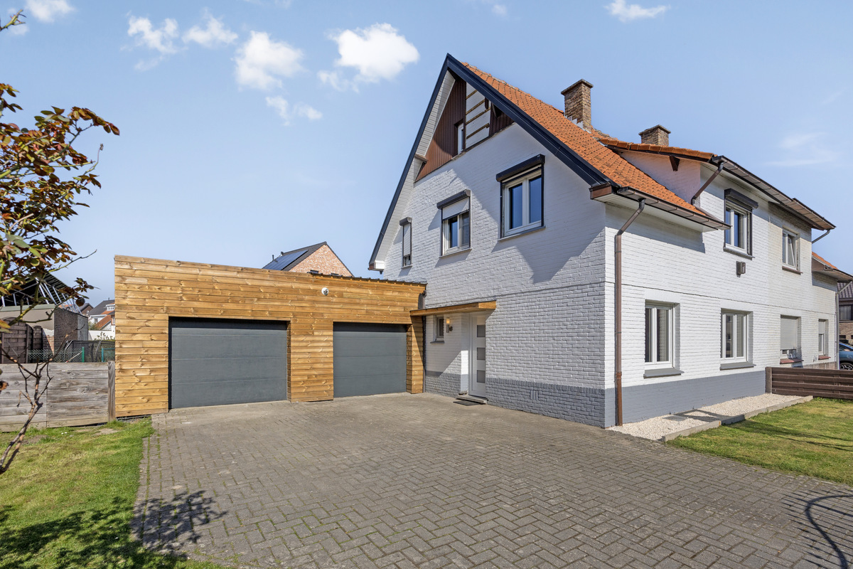 Het gelijkvloers beschikt daarnaast over een slaapkamer en een vernieuwde badkamer, wat extra comfort biedt voor wie graag alles op één niveau heeft. Verder zijn er nog een aparte berging en een interne toegang tot de twee inpandige garages.