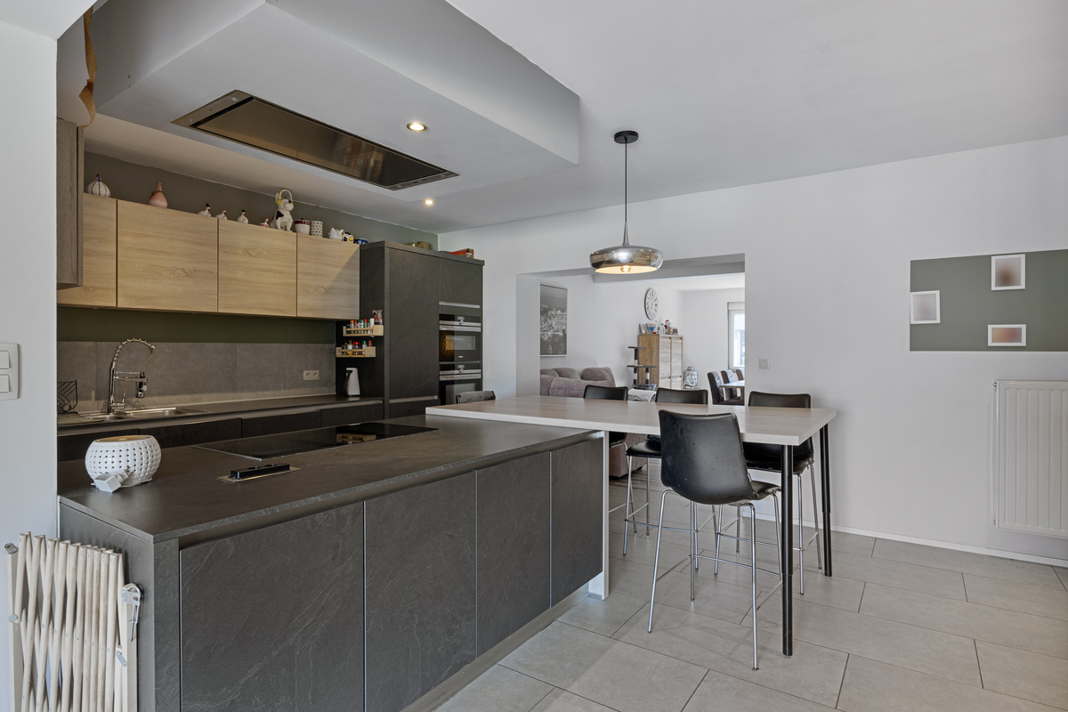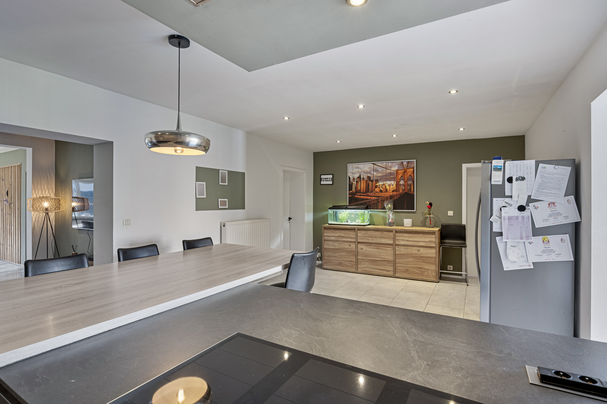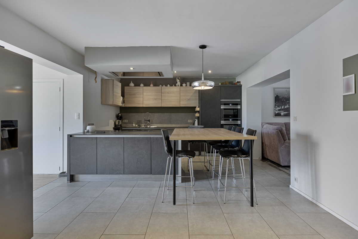 Bij binnenkomst wordt u verwelkomd in een royale woonkamer met veel natuurlijk licht. Deze gezellige ruimte biedt niet alleen voldoende plaats voor een comfortabele zithoek, maar heeft ook een aparte hoek die perfect kan dienen als bureau of speelruimte. De open leefruimte loopt naadloos over in de moderne, volledig vernieuwde keuken met eetgedeelte. De keuken is ruim en praktisch ingedeeld, ideaal voor kookliefhebbers en gezinsmaaltijden. Aansluitend vindt u een lichtrijke veranda met een prachtig zicht op de tuin.