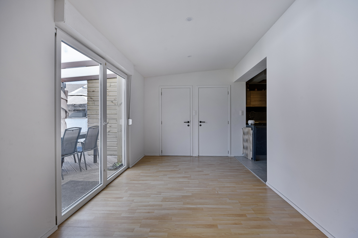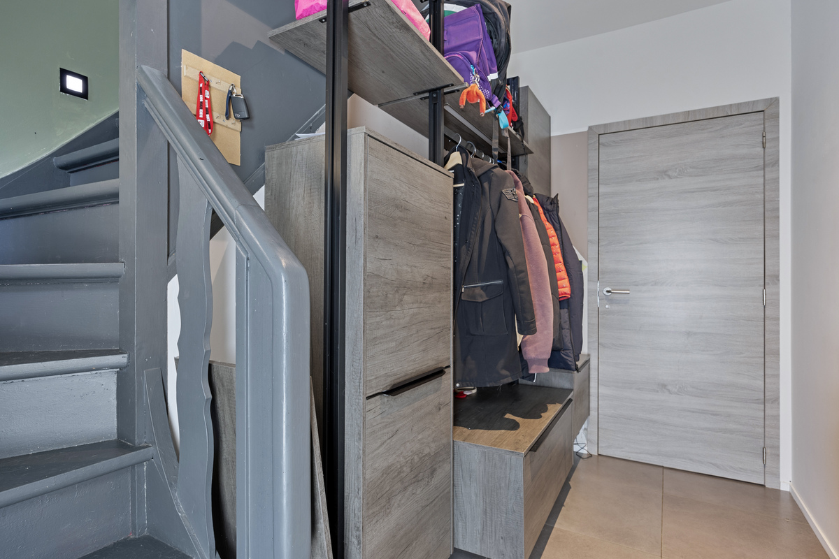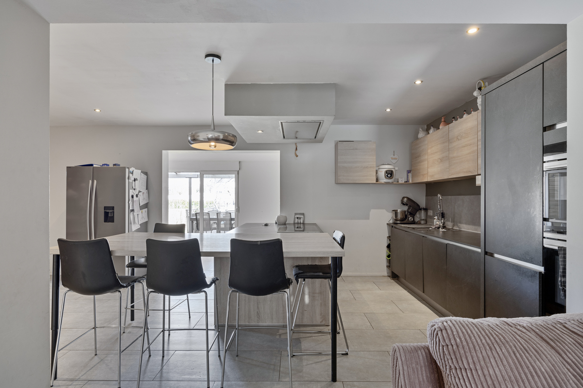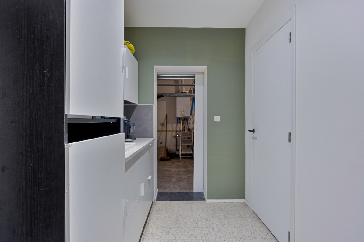 Bij binnenkomst wordt u verwelkomd in een royale woonkamer met veel natuurlijk licht. Deze gezellige ruimte biedt niet alleen voldoende plaats voor een comfortabele zithoek, maar heeft ook een aparte hoek die perfect kan dienen als bureau of speelruimte. De open leefruimte loopt naadloos over in de moderne, volledig vernieuwde keuken met eetgedeelte. De keuken is ruim en praktisch ingedeeld, ideaal voor kookliefhebbers en gezinsmaaltijden. Aansluitend vindt u een lichtrijke veranda met een prachtig zicht op de tuin.