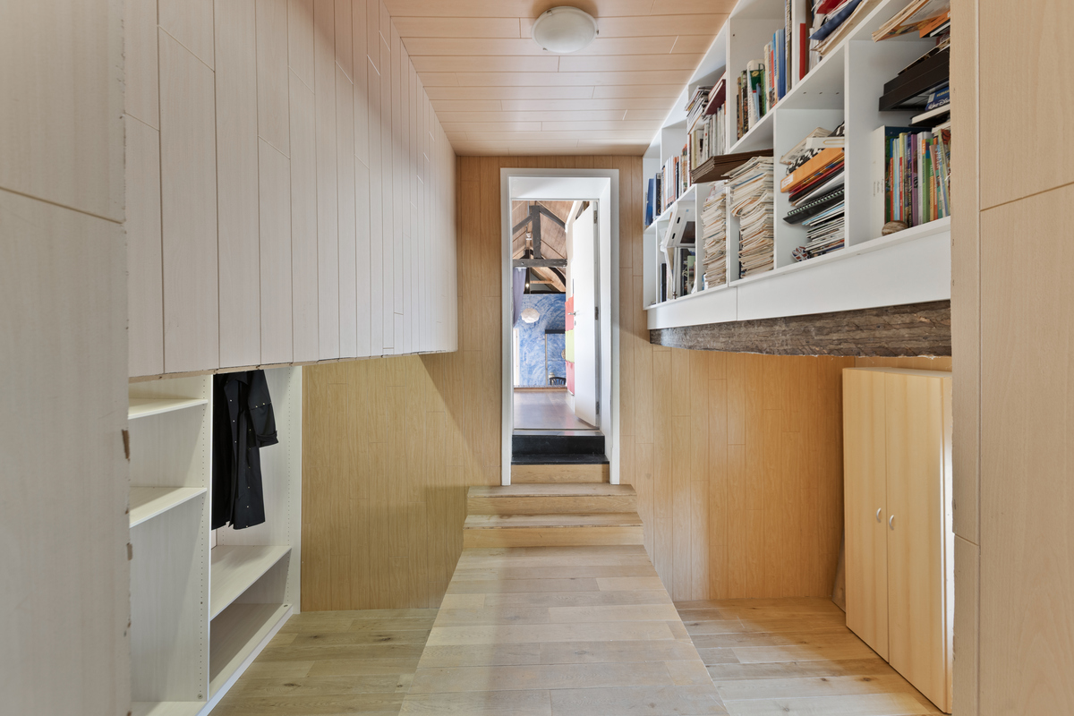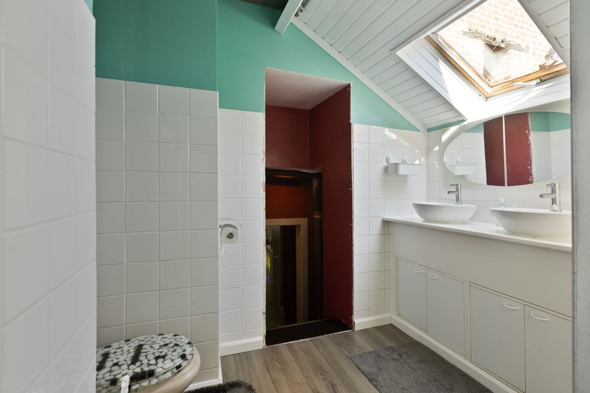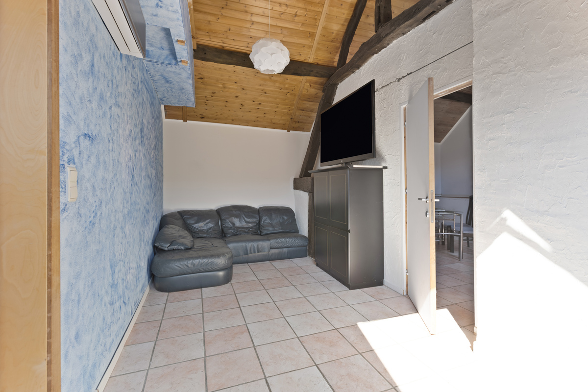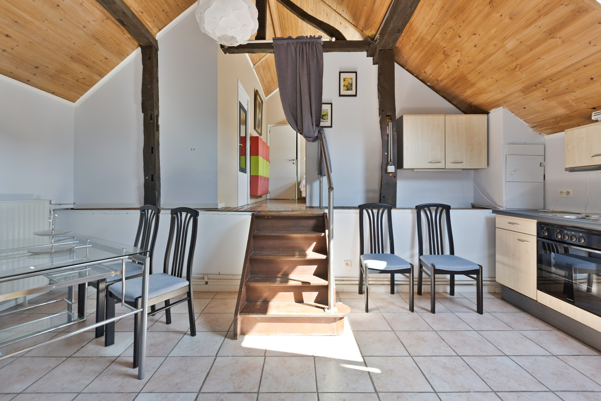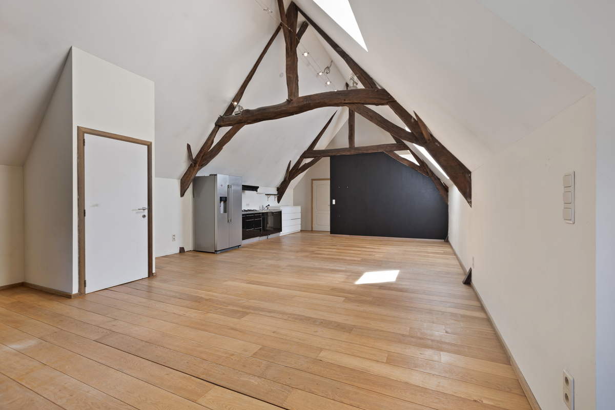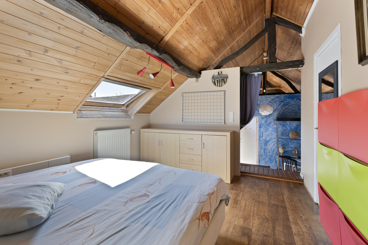 Boven bevindt zich een prachtige studio met hoog plafond en open balkenstructuur – ideaal als bijkomende B&B-unit of gastenverblijf. Daarnaast is er nog een tweede studio bereikbaar via deze verdieping. Deze twee eenheden zouden eventueel aan bij de B&B toegevoegd kunnen worden.