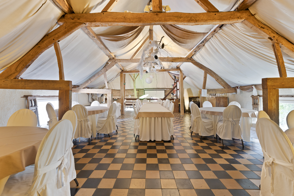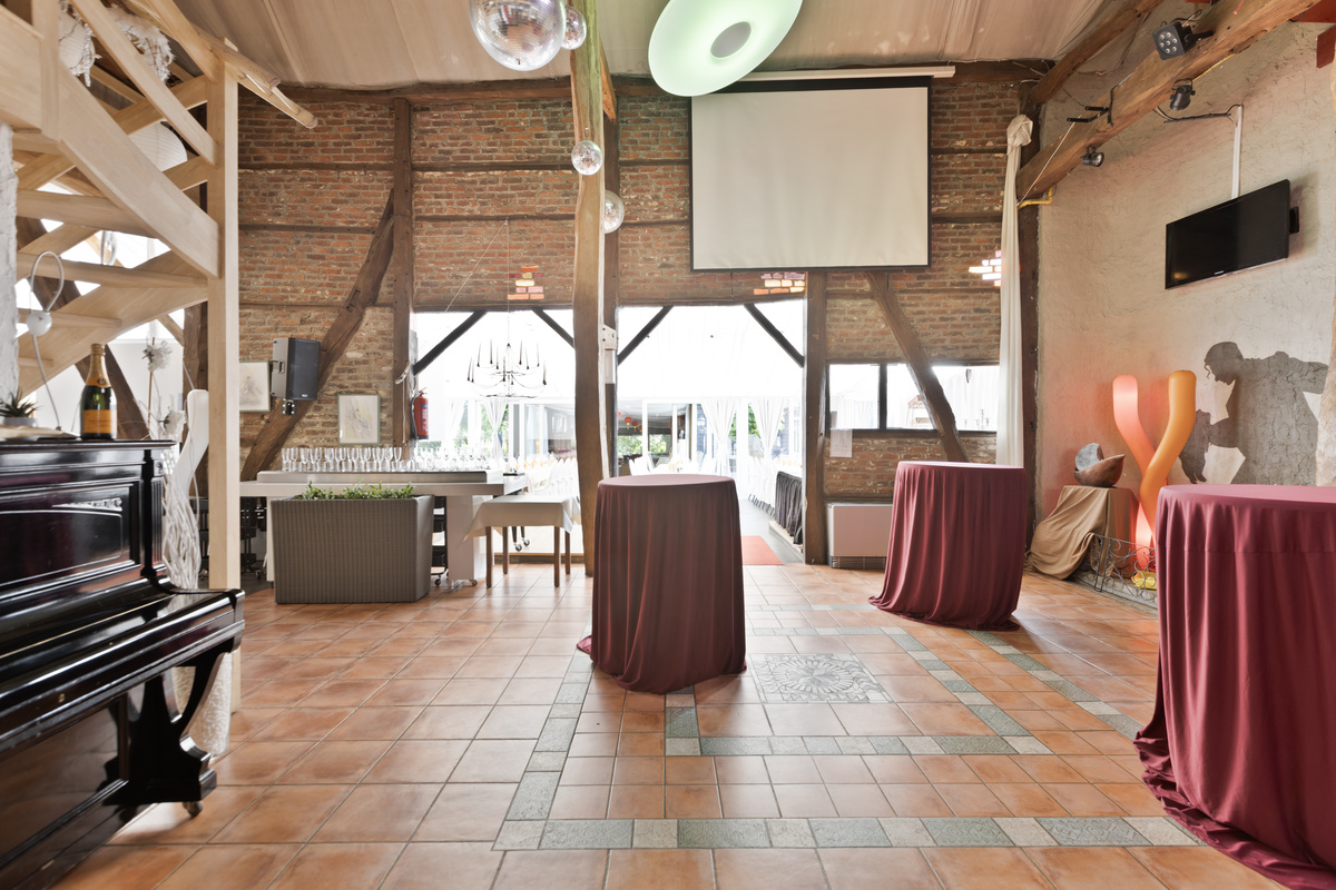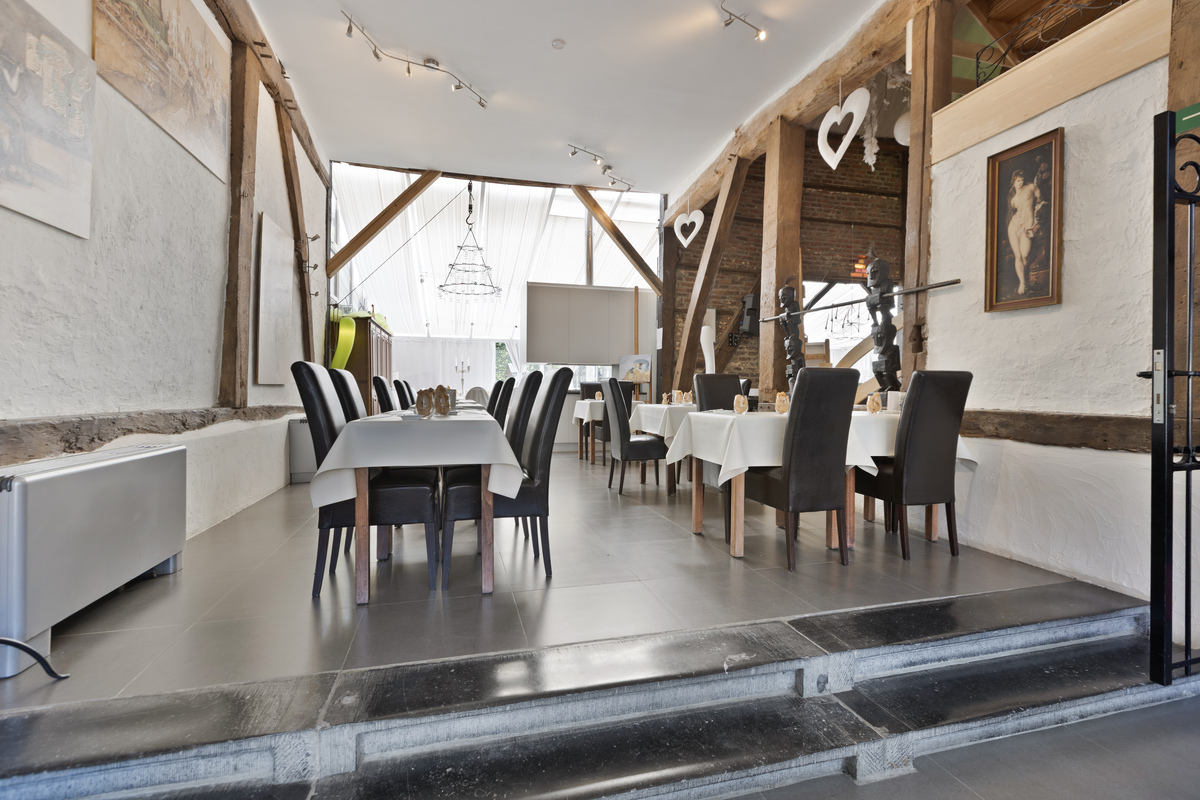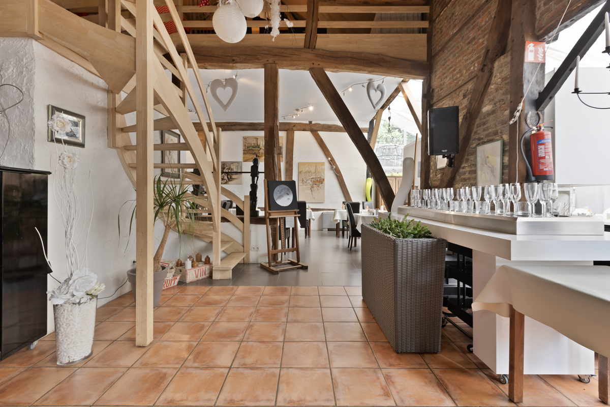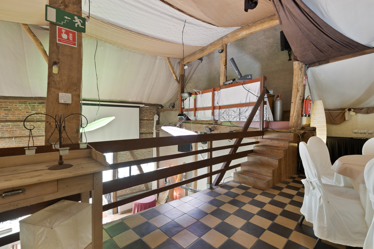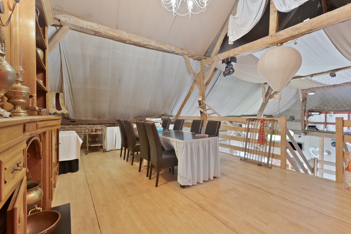 De grote feestzaal ademt karakter dankzij de authentieke houten balken en open opbouw. Ze biedt ruimte aan 200 zitplaatsen of 600 staande gasten, inclusief verhoogde DJ-ruimte en extra open verdieping voor extra capaciteit. Achter de zaal bevindt zich een grote bergruimte.