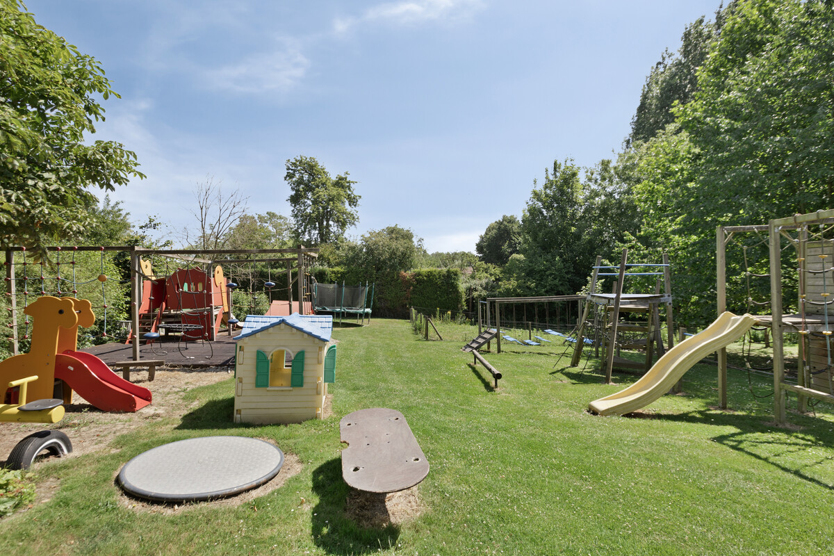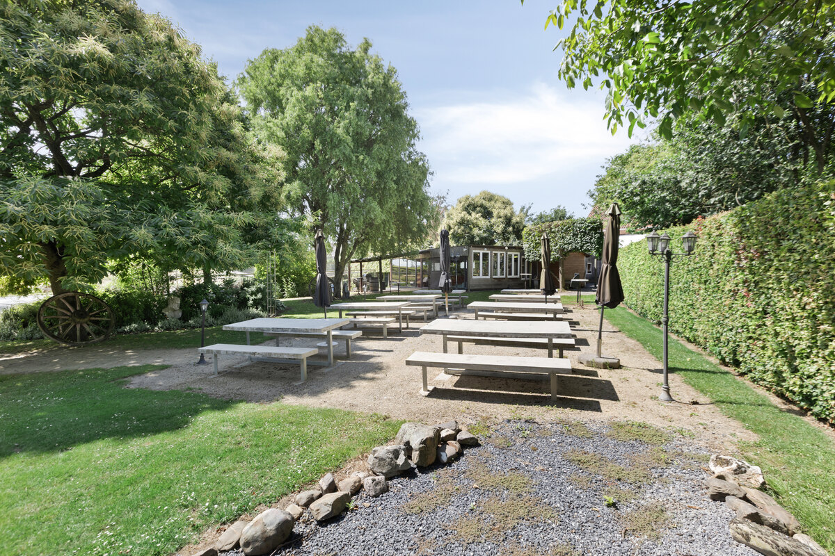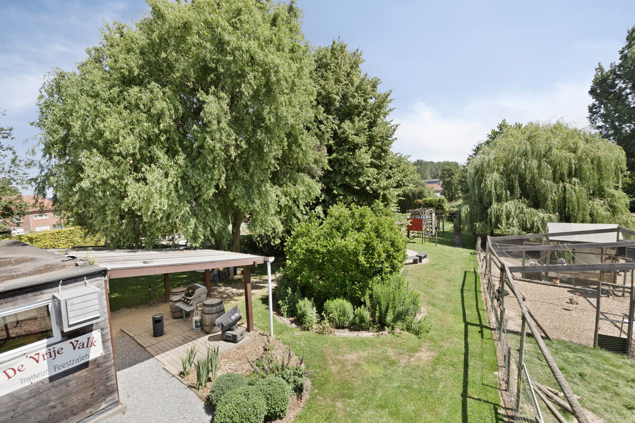 Grenzend aan de zaal werd een niet-vergunde uitbouw geplaatst die uitkomt in de aangelegde tuin met zithoekjes, grote speeltuin voor veel vertier en ook nog een dierenparkje – een sfeervolle meerwaarde voor elk evenement.