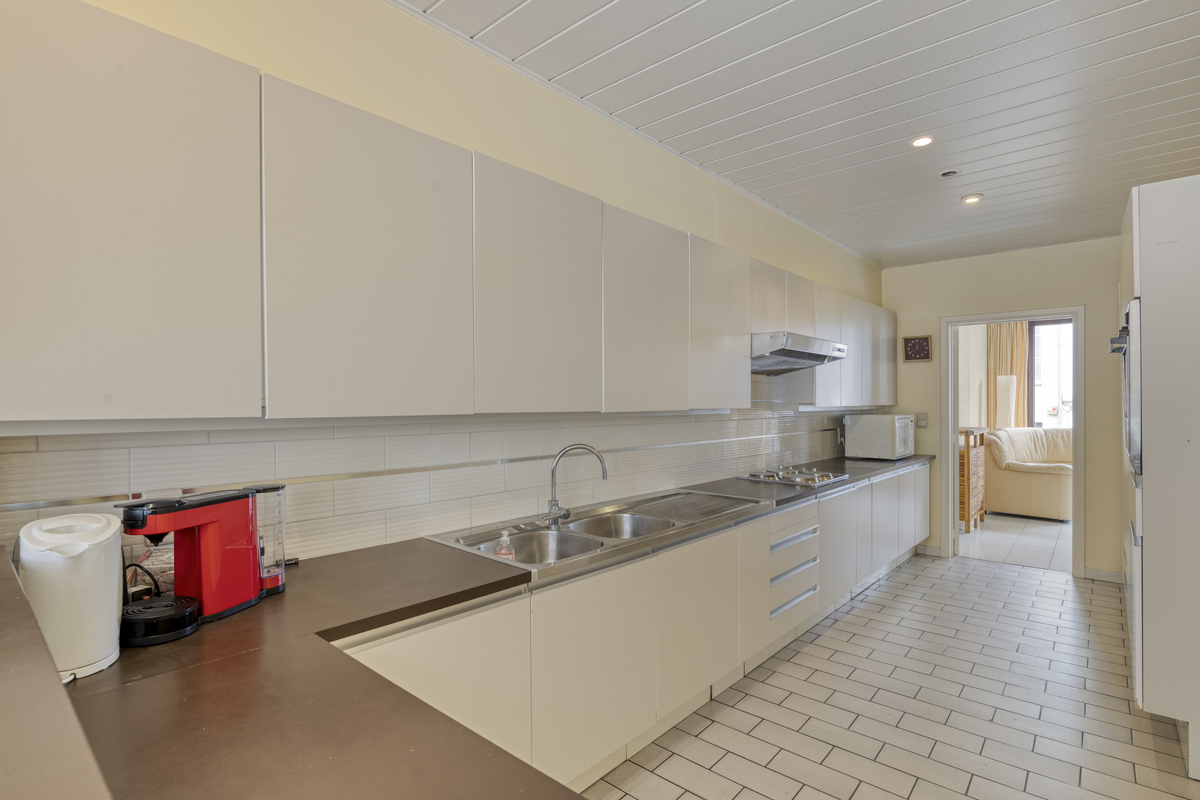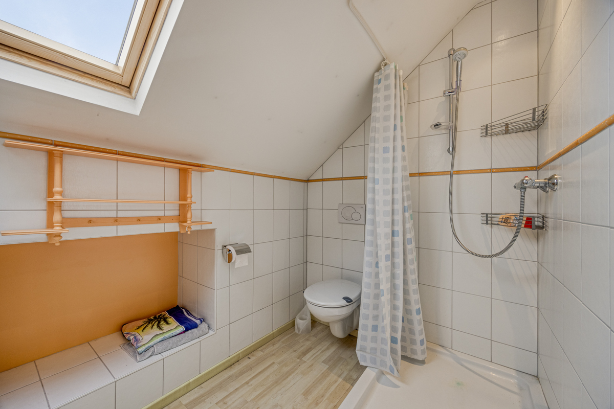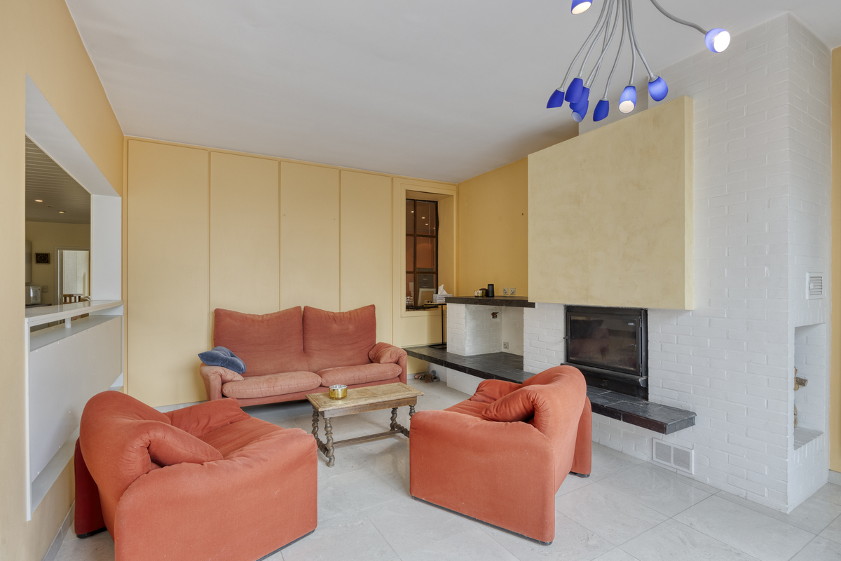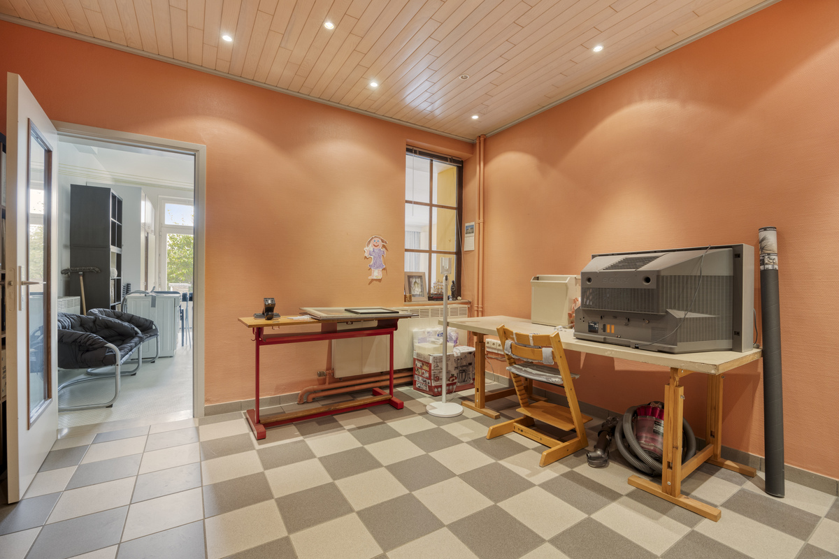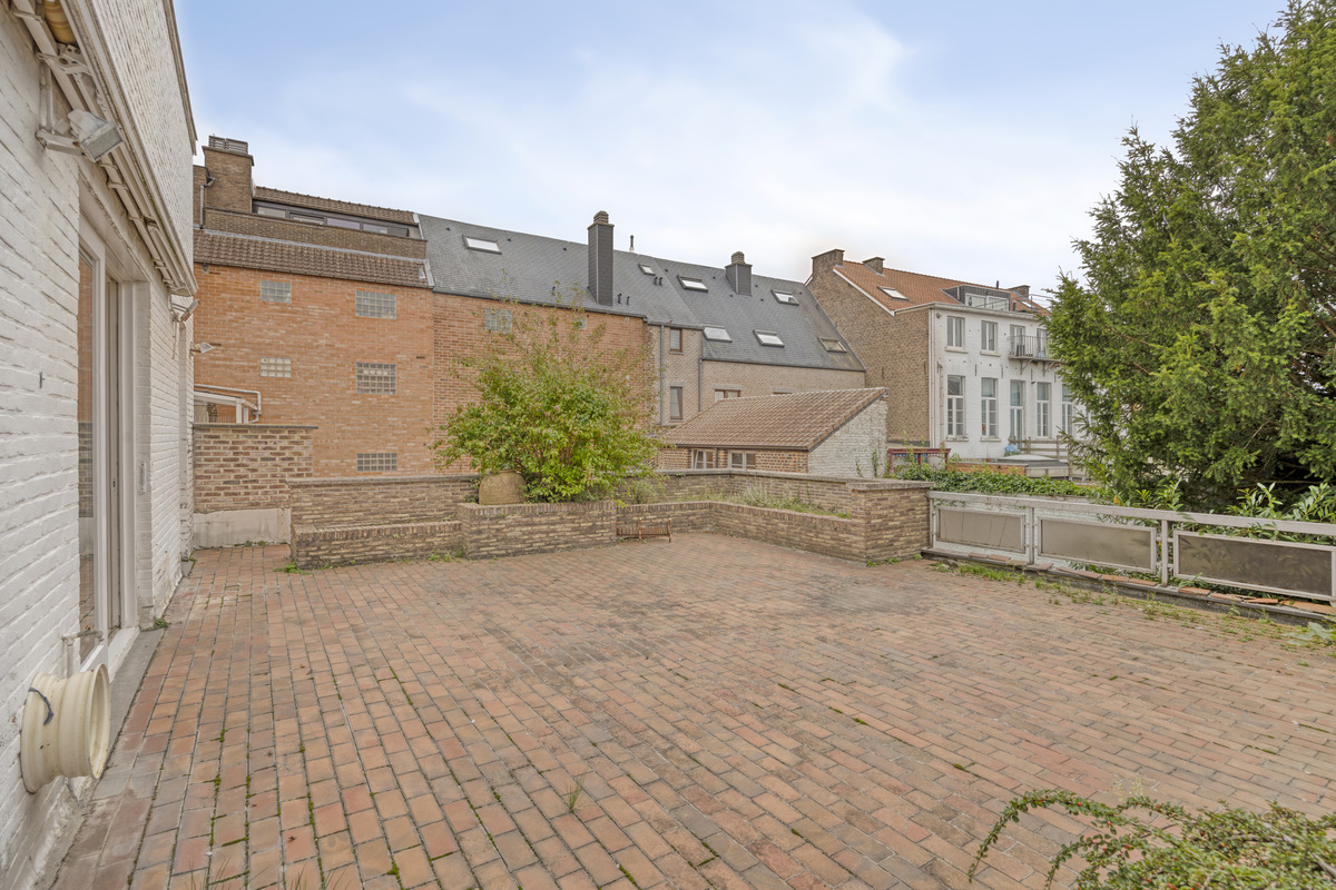 Eerste verdieping (ca. 140 m²): Leefruimte met aparte bureelruimte, ruime woonkamer en keuken met zicht op het grote terras van 57 m², op het heerlijke ruime terras is een trap voorzien voor toegang naar de tuin. Aparte private inkom is mogelijk naar het appartement.