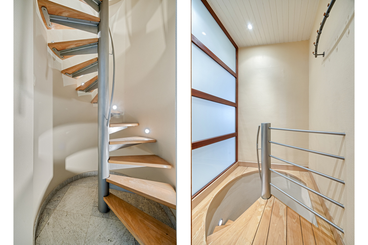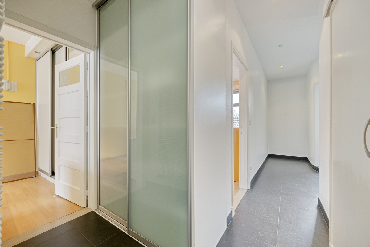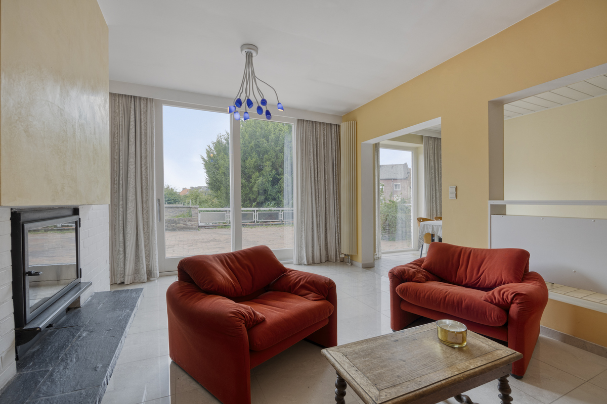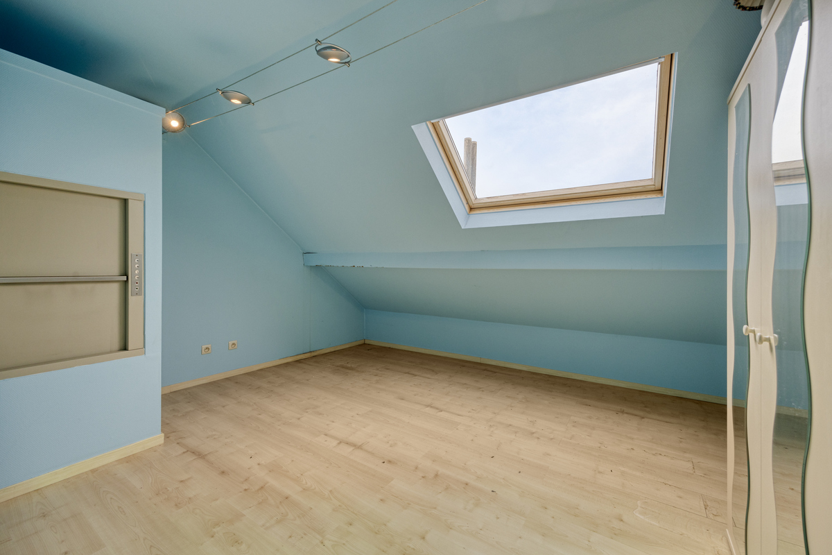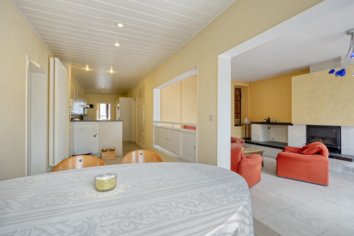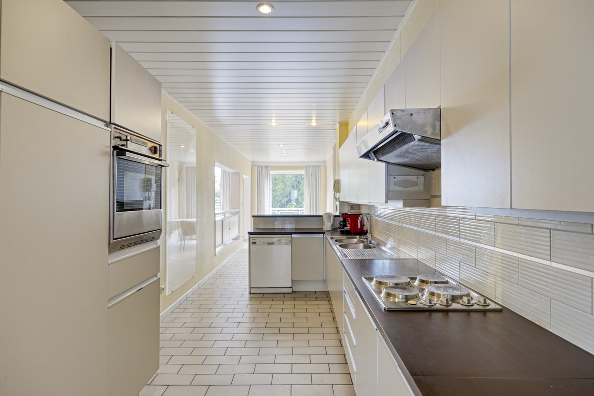 Eerste verdieping (ca. 140 m²): Leefruimte met aparte bureelruimte, ruime woonkamer en keuken met zicht op het grote terras van 57 m², op het heerlijke ruime terras is een trap voorzien voor toegang naar de tuin. Aparte private inkom is mogelijk naar het appartement.